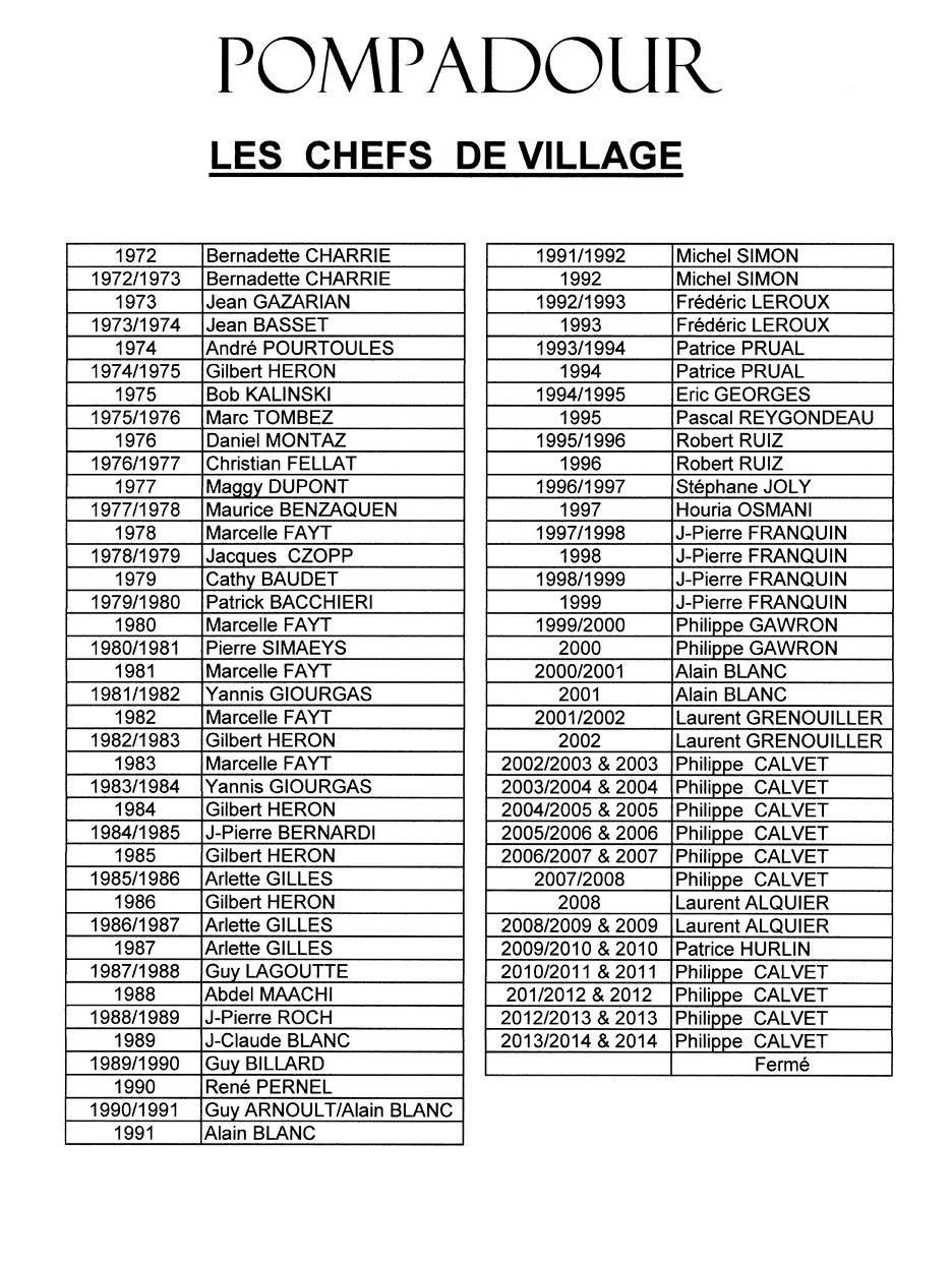Fu Bernadette CHARRIE ad aprire il villaggio nel 1972. A lei seguirono i capi villaggio che divennero clienti abituali di Pompadour. Tra questi, meritano di essere menzionati in particolare La Duchesse (Marcelle FAYT), Jean Pierre FRANQUIN, Gilbert HERON, Arlette GILLES e Philippe CALVET, che supervisionò gli ultimi anni del villaggio prima della sua chiusura.