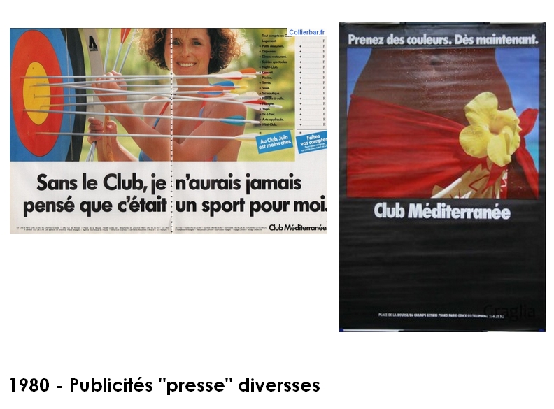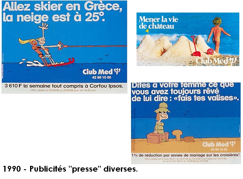 Des articles, toujours dans l’Équipe, prennent le relais en faisant des articles (on ne parle pas encore de publi reportages). Dans les Tridents de l’époque, le dessinateur Siné prête sa plume et réalise de petits dessins pour promouvoir à sa manière le Club. Quelques affiches réalisées par de grands dessinateurs, des réclames qui intègrent des coupons réponses paraissent régulièrement dans des périodiques comme Paris Match ou VSD. Quelques reportages radios ou émissions de télévision complètent la publicité pour le Club Méditerranée.