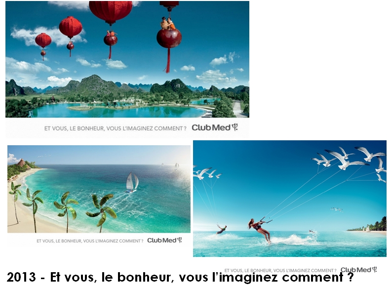 2013 : « Et vous, le bonheur, vous l’imaginez comment ? ». Cette campagne (agence Saatchi & Saatchi) utilise à nouveau le mot Bonheur dans le texte. Ce mot Bonheur semble être à nouveau redevenu le leitmotiv utilisé par le Club Med dans ses slogans comme au cours des années 80 mais l’image mis en avant change. Terminés les visages, place a une image qui fait apparaitre un paysage zen. Une préparation aux horizons chinois et à l’ère Fosun sans nul doute !