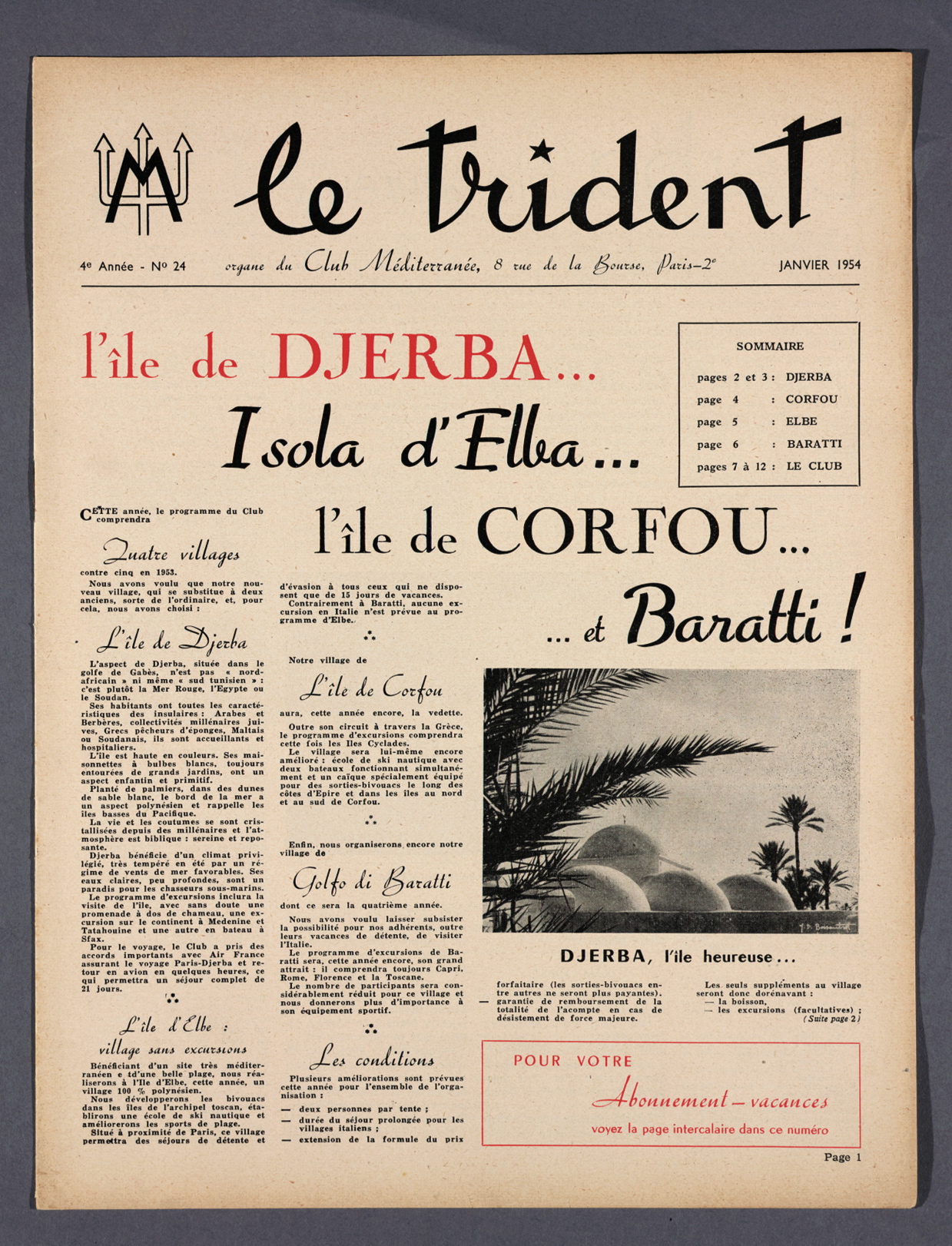 Membership registrations—the term GM came later—were carried out at 9 rue Buffaut in the 9th arrondissement of Paris by Gérard and Claudine Blitz. In Belgium, the office was located in Antwerp at 4 rue Anselme. The price for a 15-day all-inclusive vacation in the Balearic Islands was 16,800 old francs.