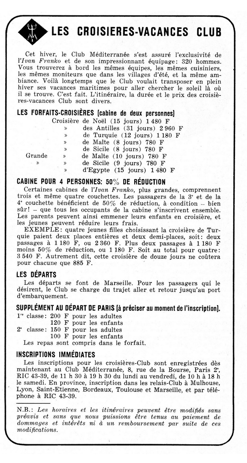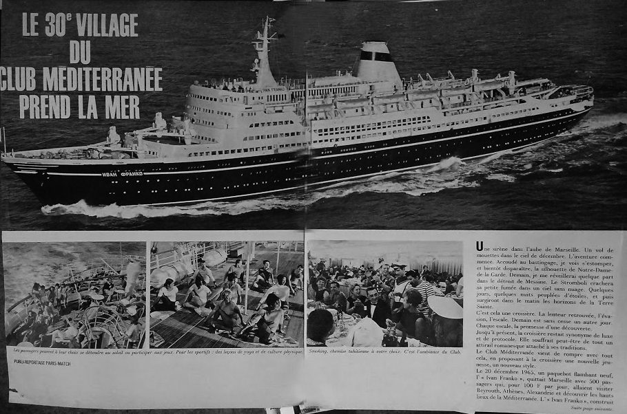 Pour la petite histoire : Le quotidien le Monde du 6 octobre 1965 titre CROISIÈRES A 100 FRANCS PAR JOUR » TOUT COMPRIS » SUR L' » IVAN-FRANKO » AVEC LE CLUB MÉDITERRANÉE